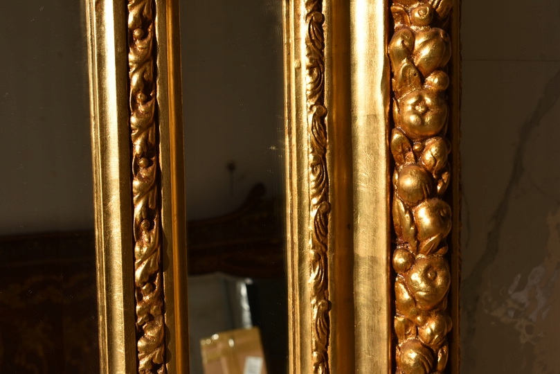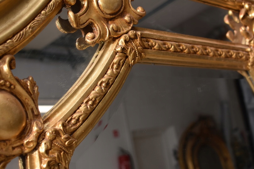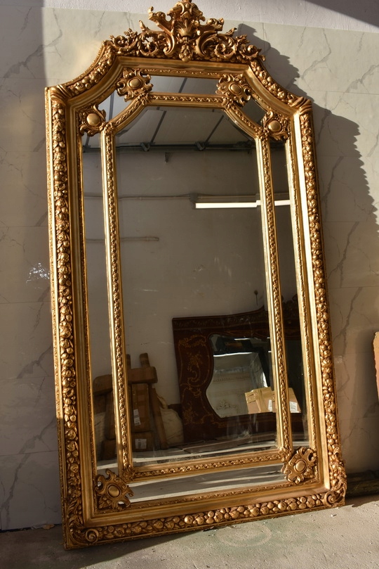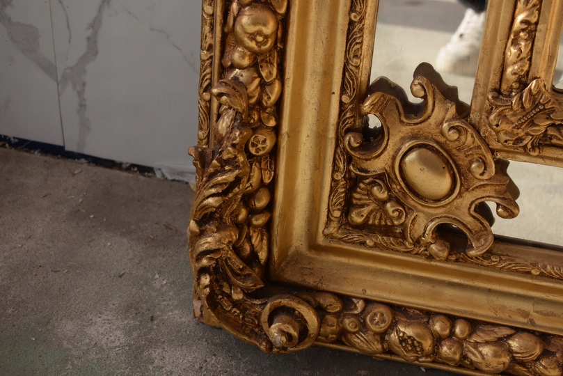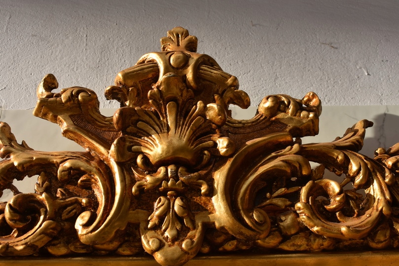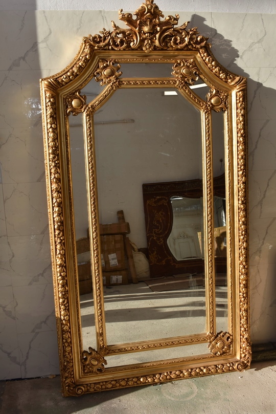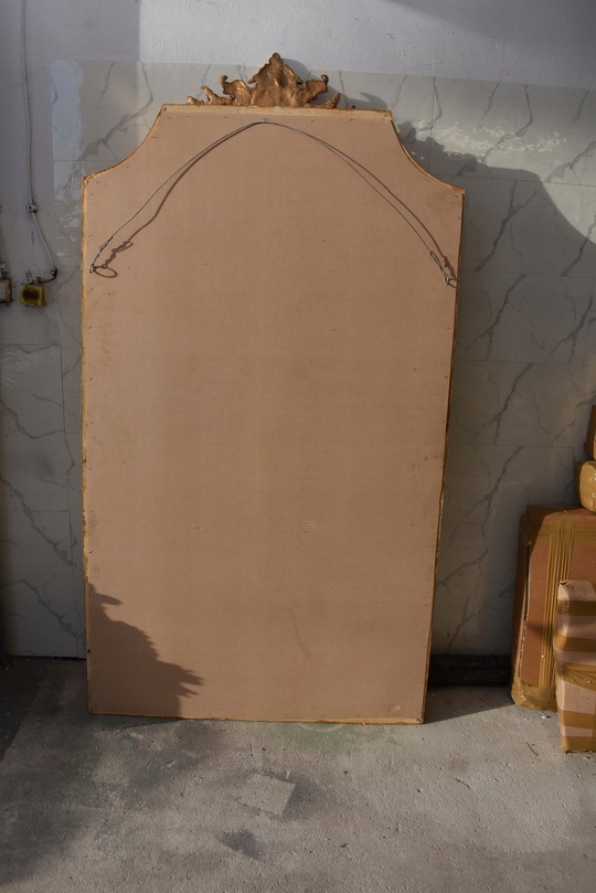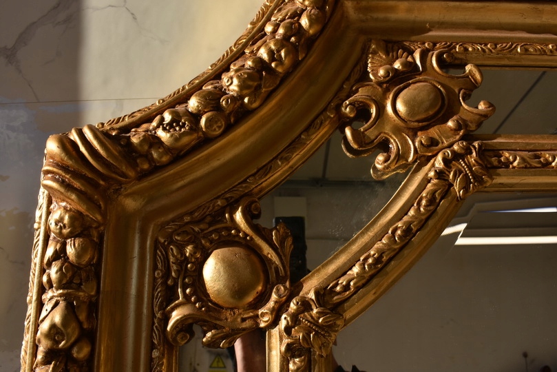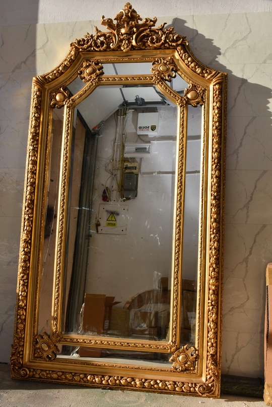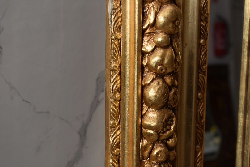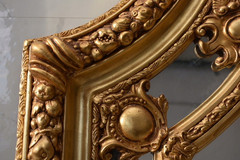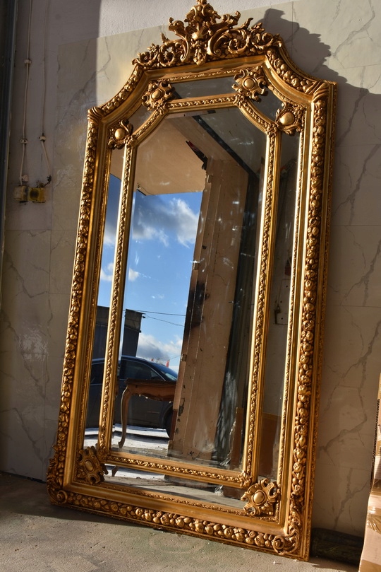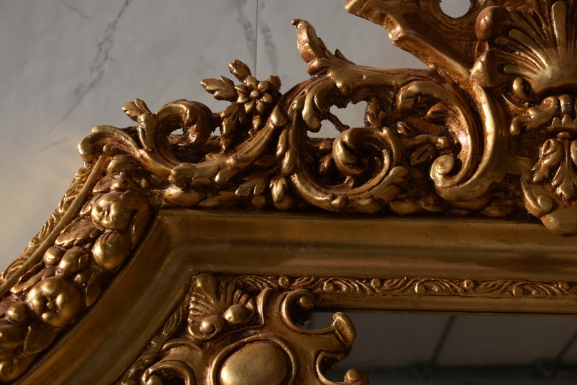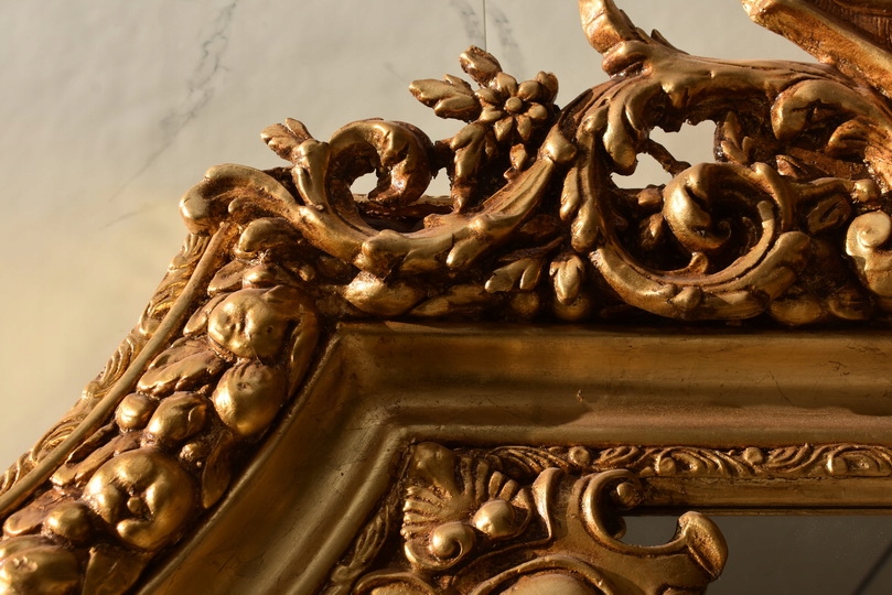 Pałacowe lustro w kolorze złota z masywną, bogato zdobioną ramą. Kryształowa tafla pięknie odbija światło, a imponujący format 215 × 115 cm nadaje wnętrzu luksusowy, reprezentacyjny charakter. Idealne do salonu, holu lub stylowej rezydencji.