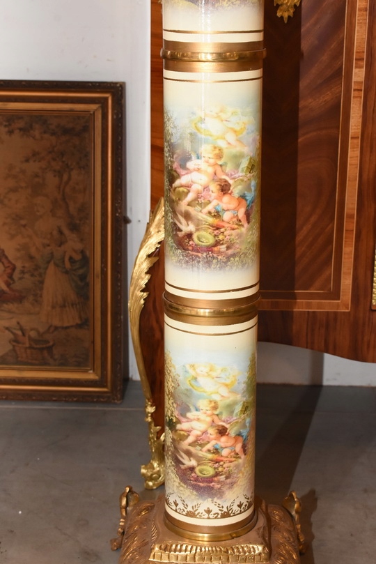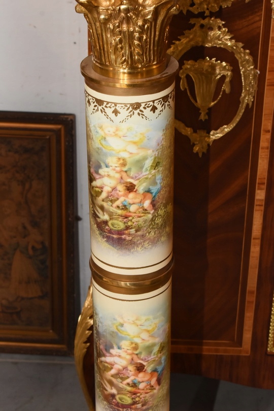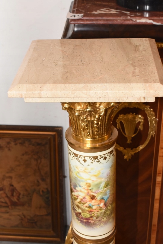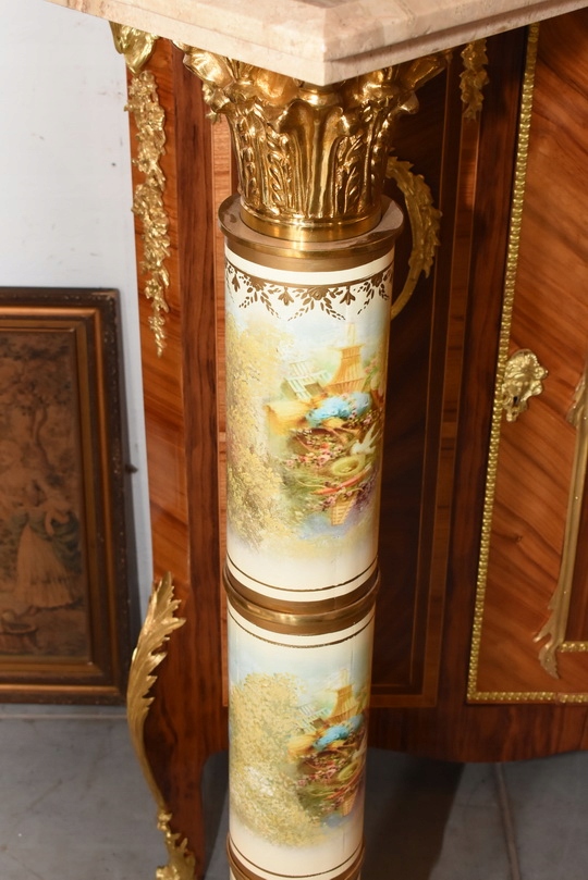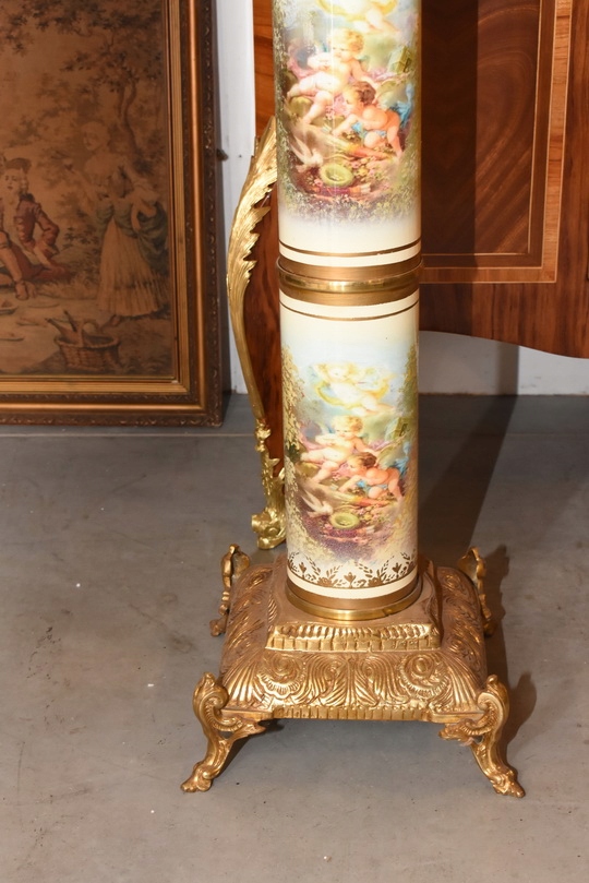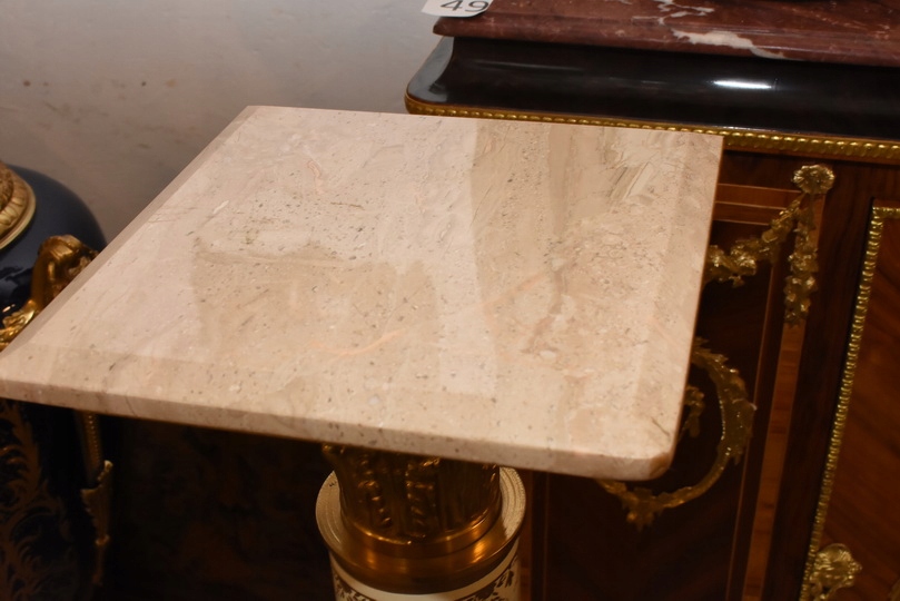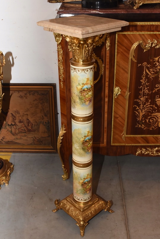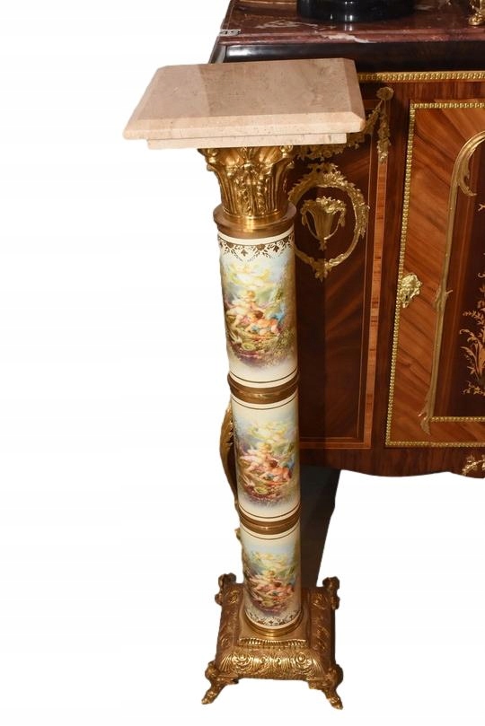 Na sprzedaż wyjątkowy pałacowy postument marmurowy w formie klasycznej kolumny. Wykonany z połączenia naturalnego marmuru, elementów z brązu oraz złoconych detali, prezentuje się niezwykle elegancko i dostojnie.