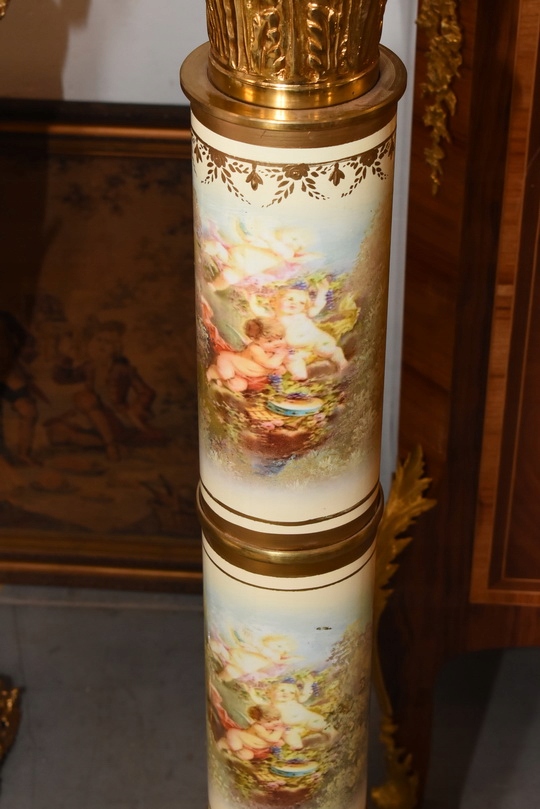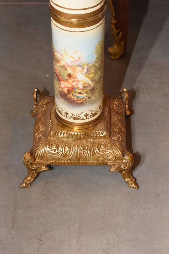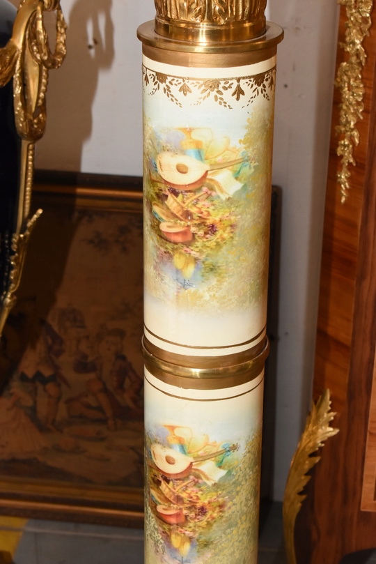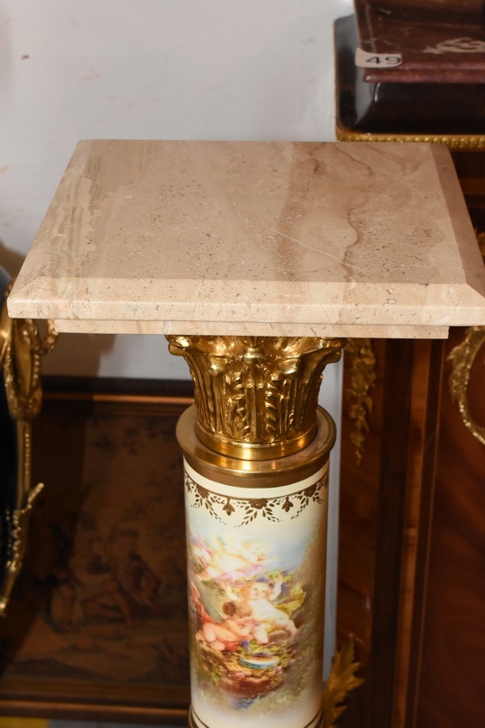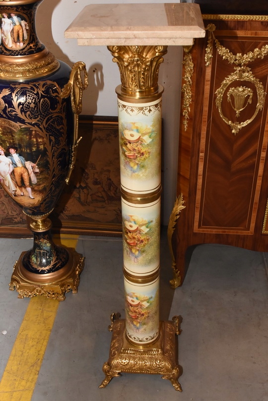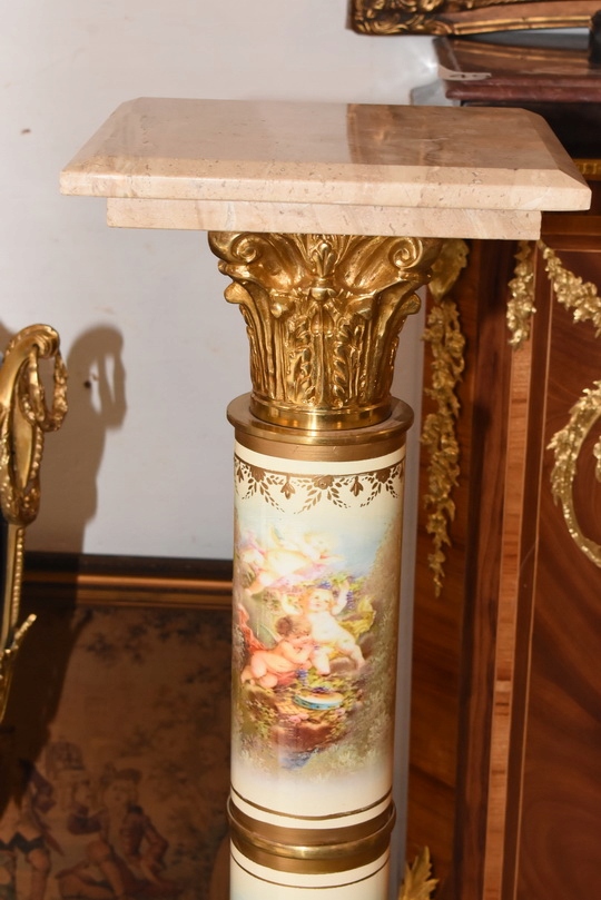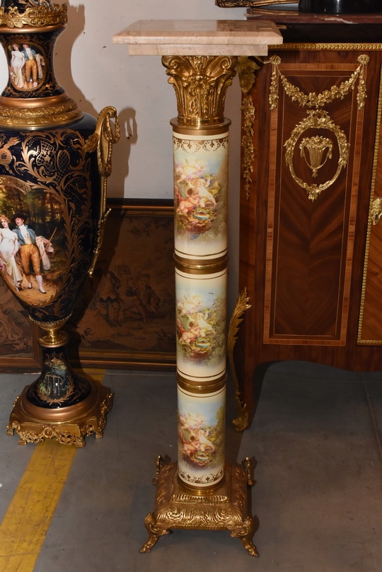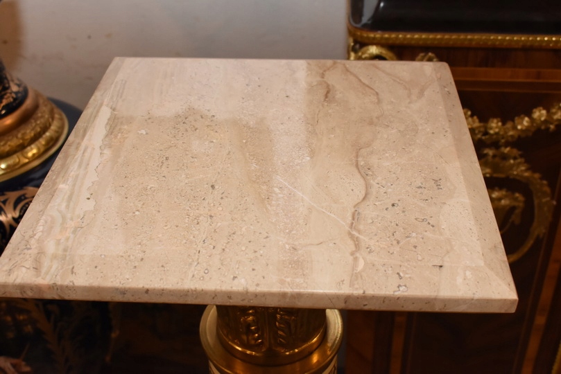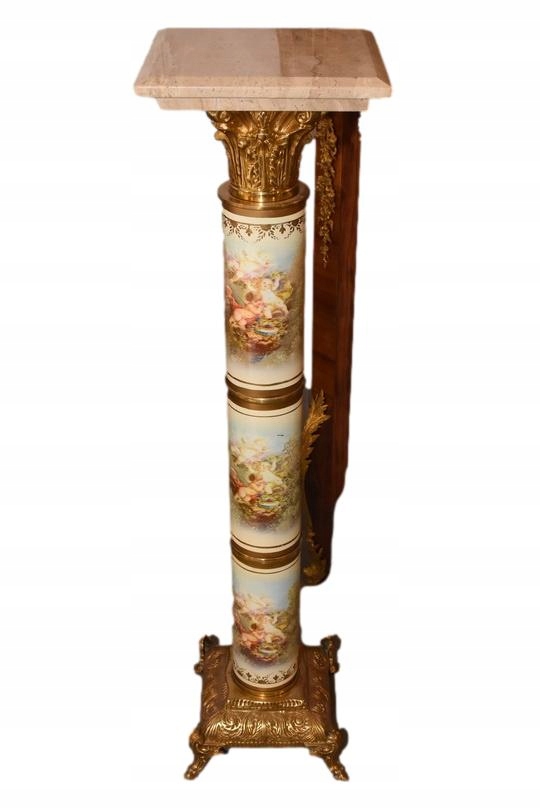 Na sprzedaż wyjątkowy pałacowy postument marmurowy w formie klasycznej kolumny. Wykonany z połączenia naturalnego marmuru, elementów z brązu oraz złoconych detali, prezentuje się niezwykle elegancko i dostojnie.