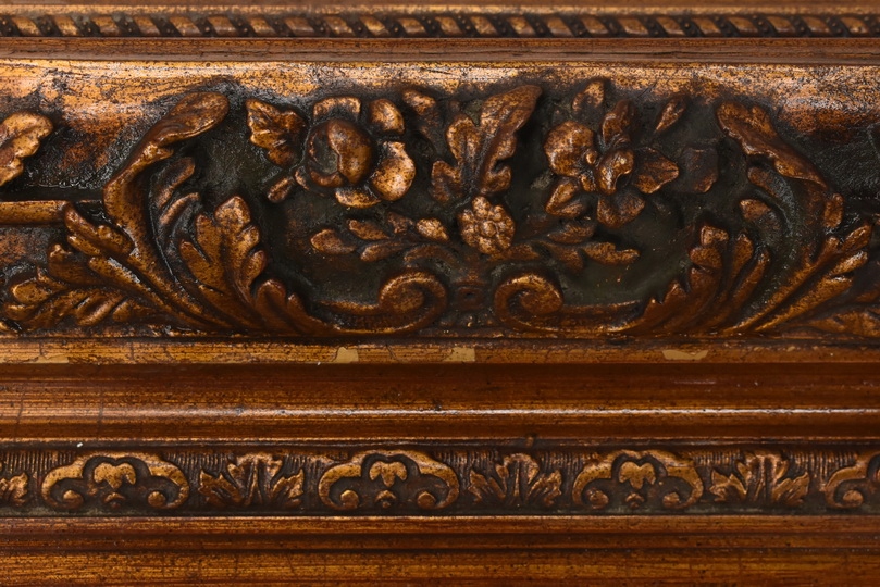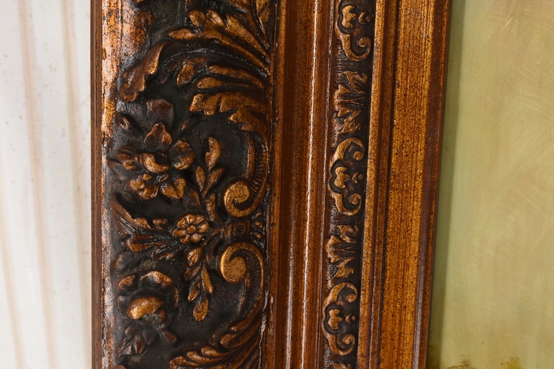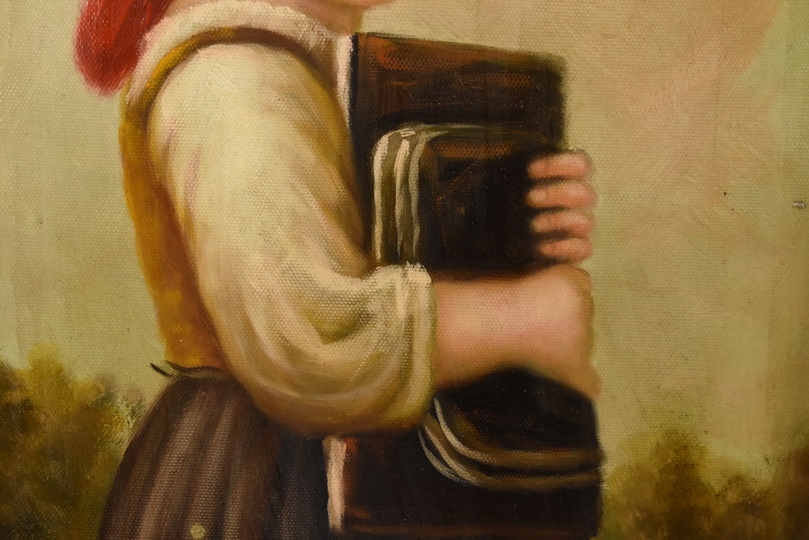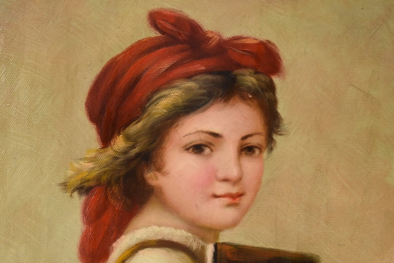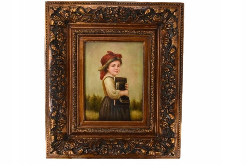 Elegancki obraz przedstawiający portret kobiety lub dziewczynki w czerwonej chuście, emanujący subtelnością i delikatnym urokiem. Starannie wykonane detale i ciepła kolorystyka nadają dziełu ponadczasowy charakter, a zdobiona rama podkreśla jego artystyczny i dekoracyjny walor. Idealny do wnętrz klasycznych, stylowych i reprezentacyjnych.