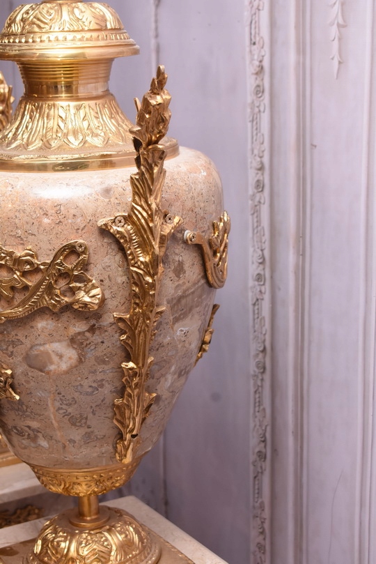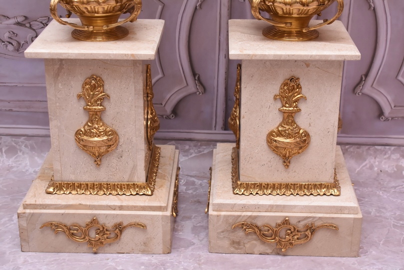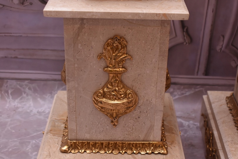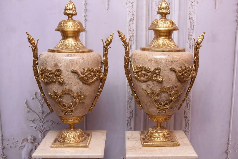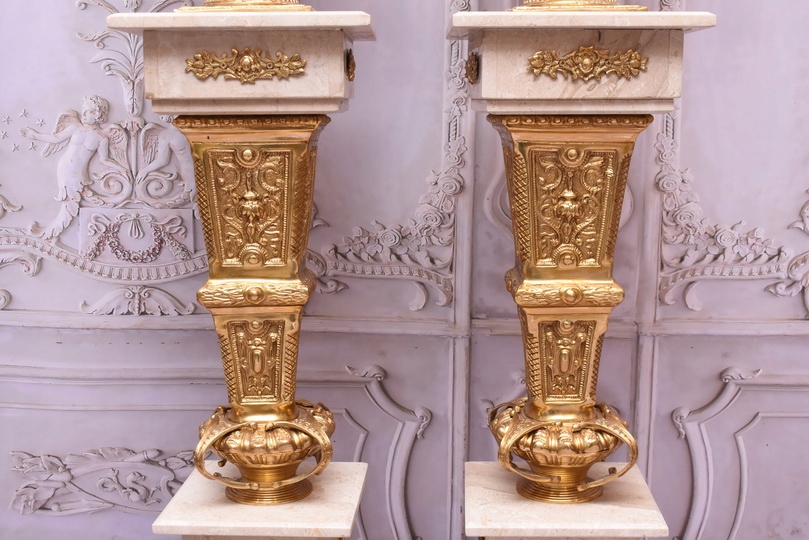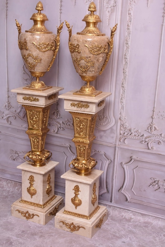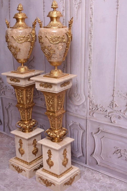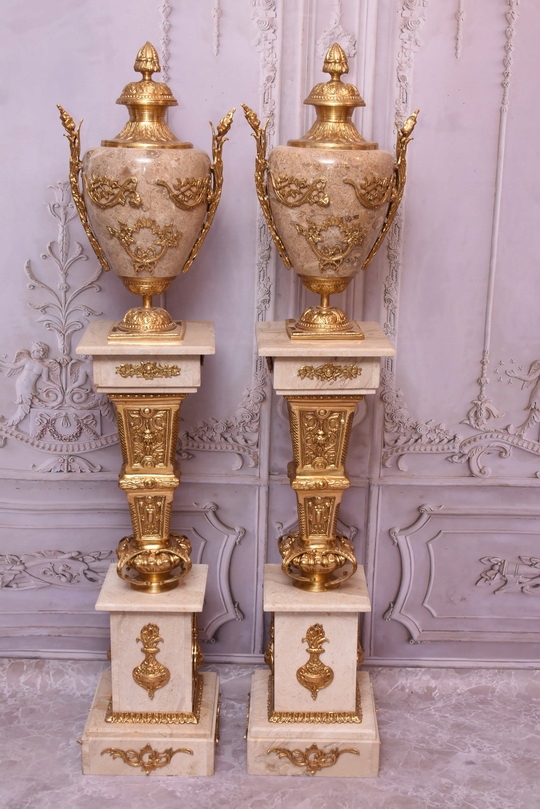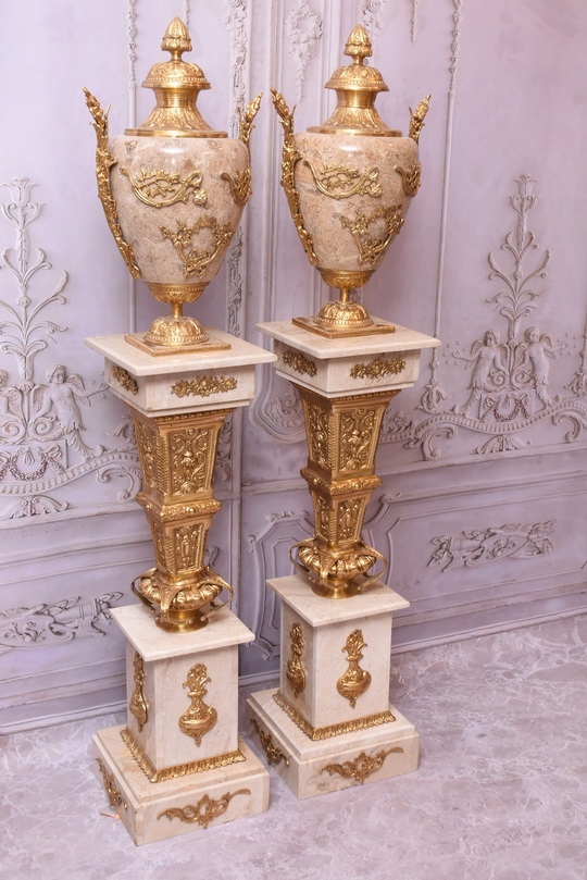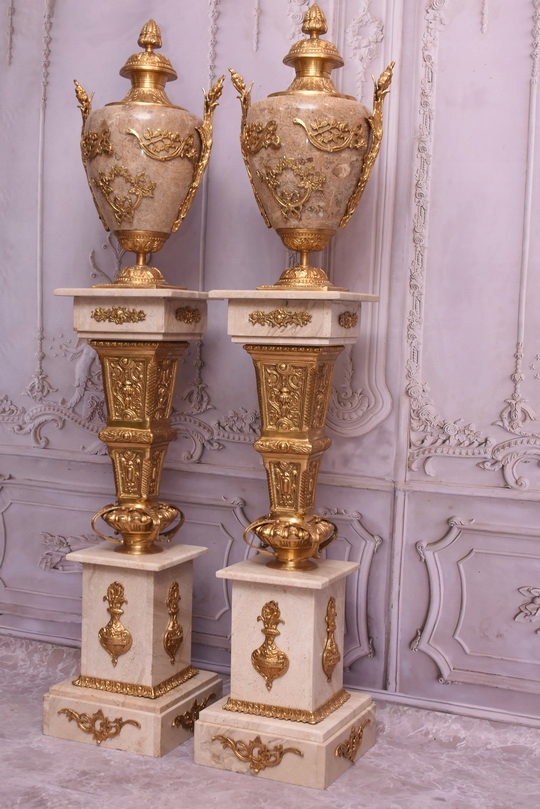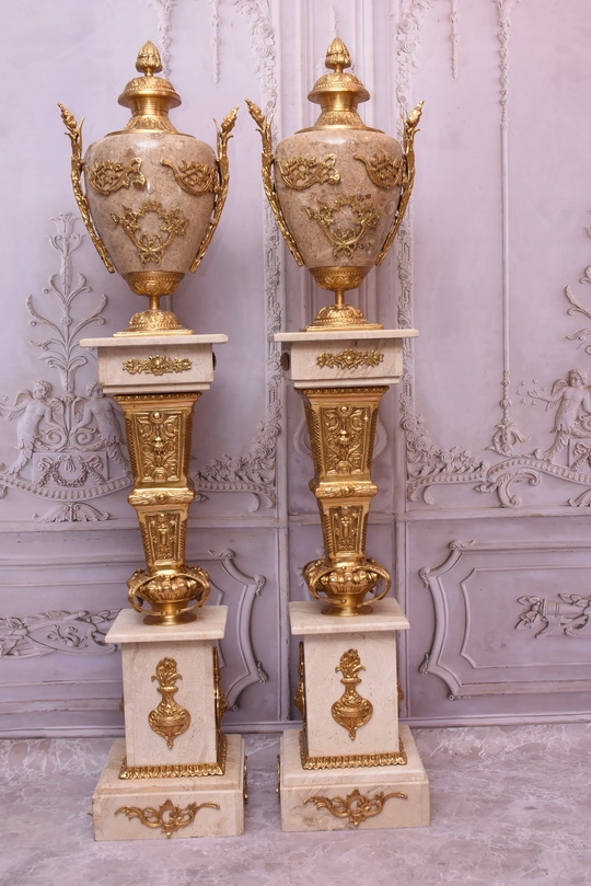 Witam, w dniu dzisiejszym pragnę zaoferować Państwu przepiękne GIGANTYCZNE masywne postumenty wraz z wazami wykonane z marmuru oraz okute brązem.