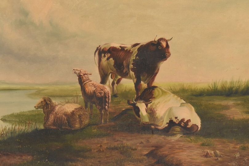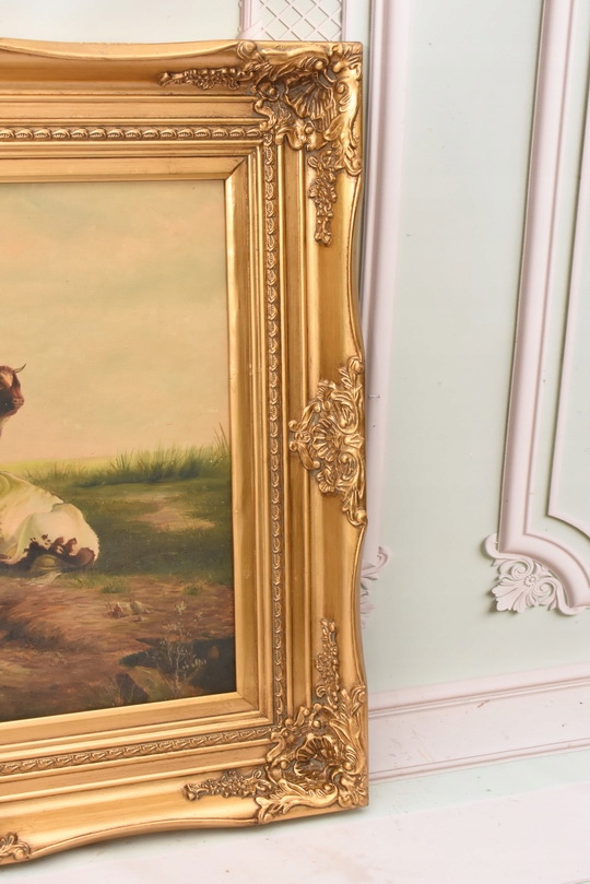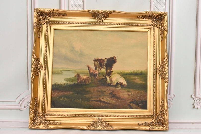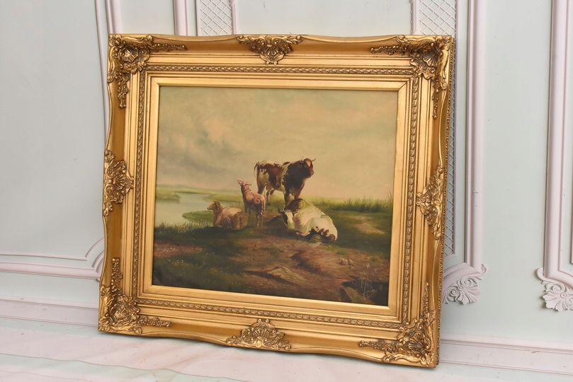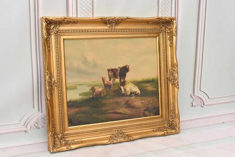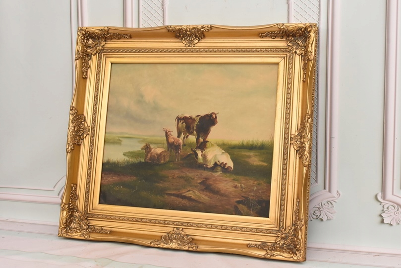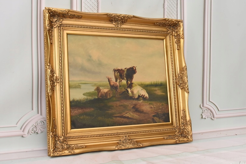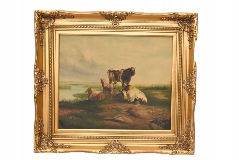 Obraz Olejny – „Stado Krów na Pastwisku” – Scena Rodzajowa ze Złotą Ramą