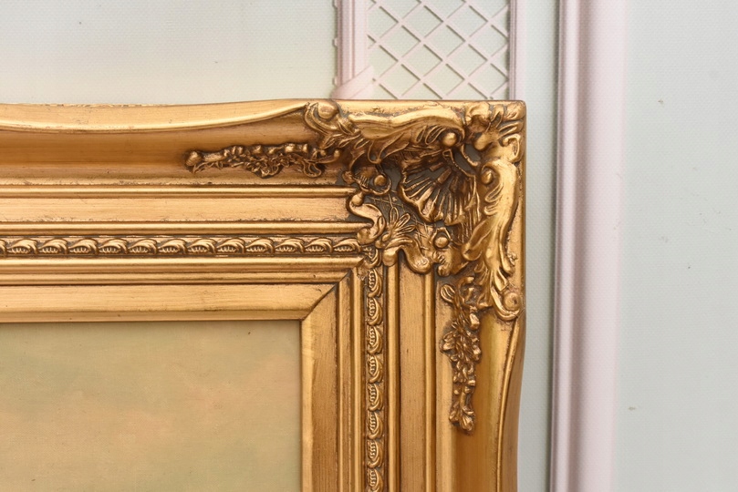 Malowniczy obraz olejny przedstawiający stado krów na pastwisku, oprawiony w elegancką złotą ramę. Idealny do salonu, jadalni lub gabinetu, wprowadzając do wnętrza klasyczny, sielski i naturalistyczny klimat.