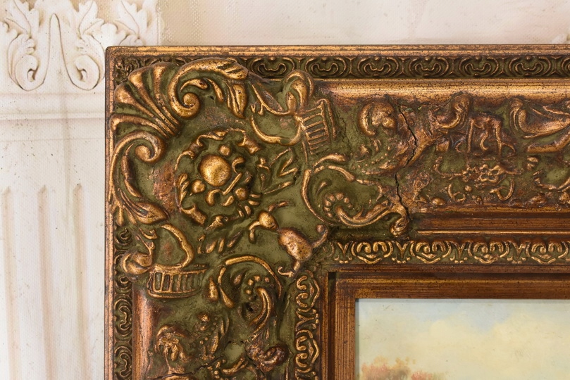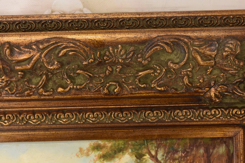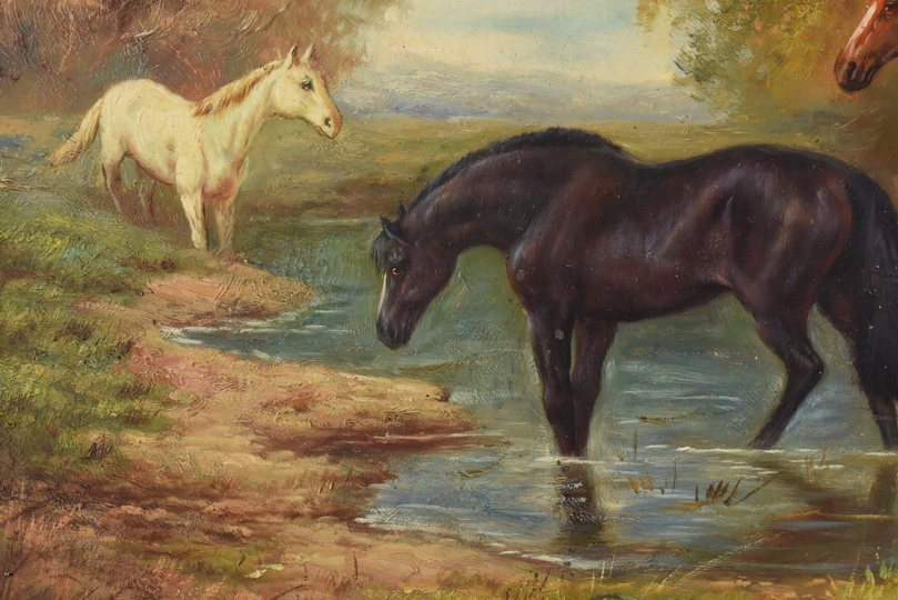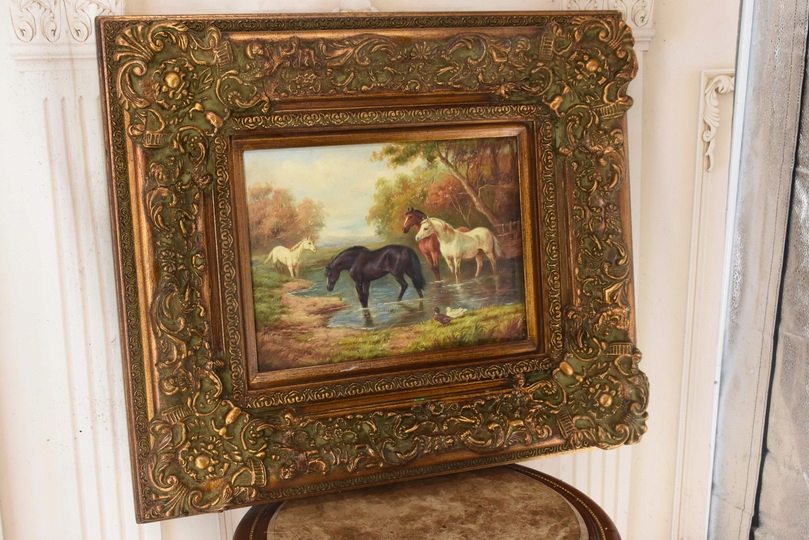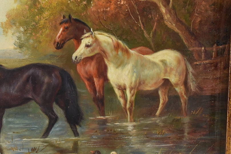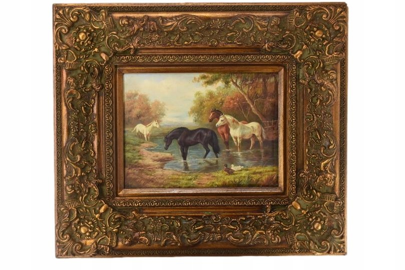 Malowniczy obraz olejny przedstawiający stado koni przy rzece w towarzystwie kaczek, w urokliwej scenie rodzajowej. Naturalna kolorystyka i staranne detale oddają spokojny, sielski klimat wiejskiego krajobrazu. Doskonała dekoracja do wnętrz klasycznych, rustykalnych i miłośników tematyki zwierzęcej.