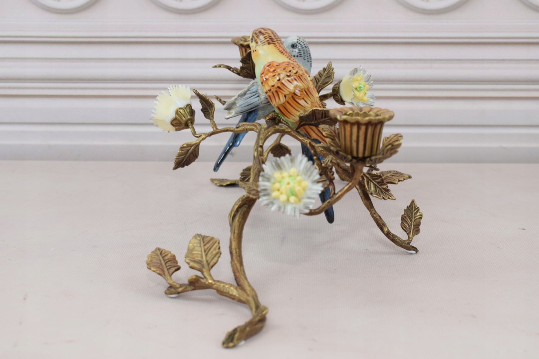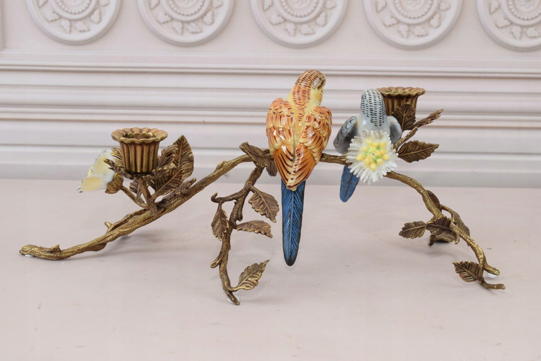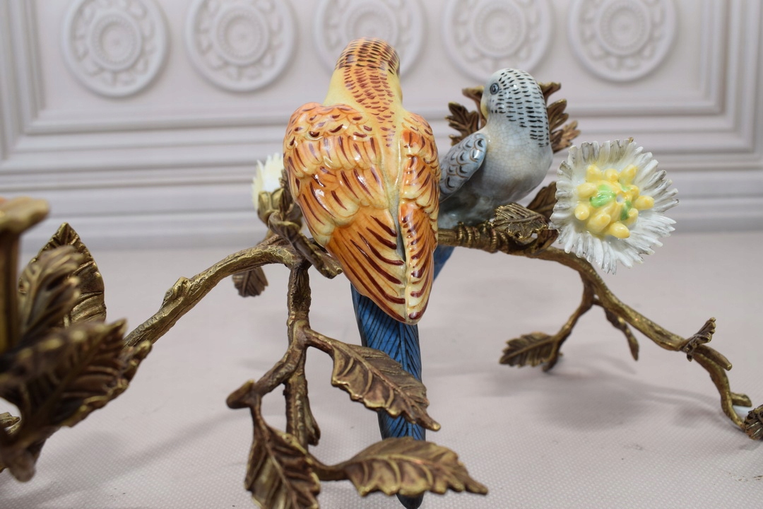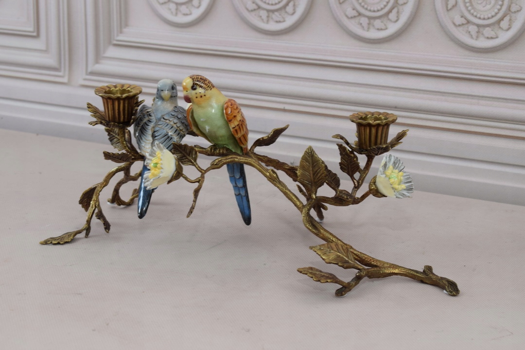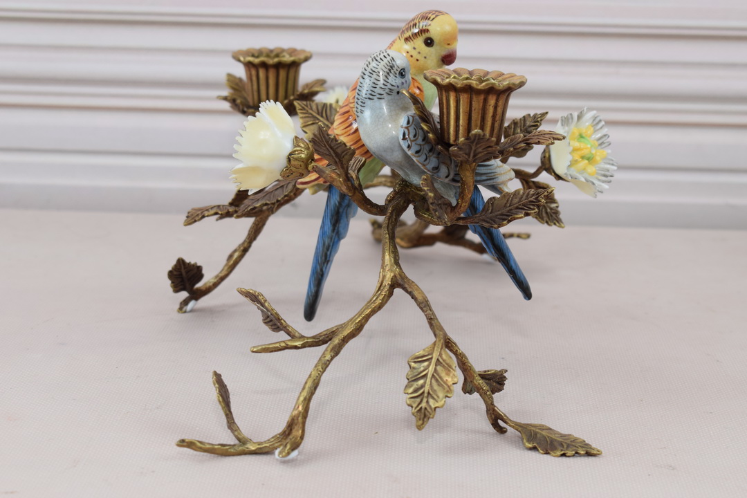 Witam, w dniu dzisiejszym pragnę zaoferować Państwu świecznik, PAPUGI wykonane z porcelany zaś świecznik i zdobienia z brązu.