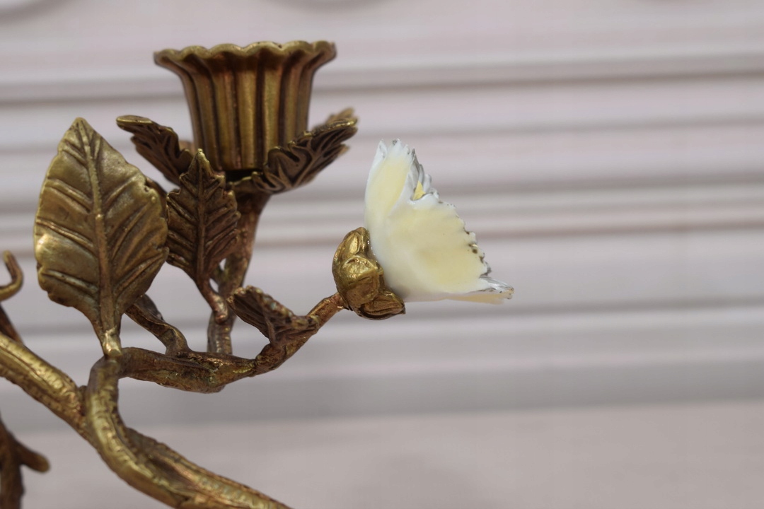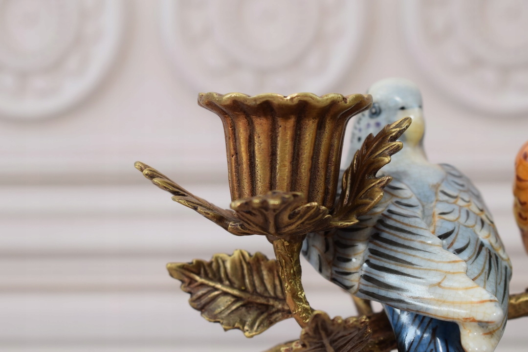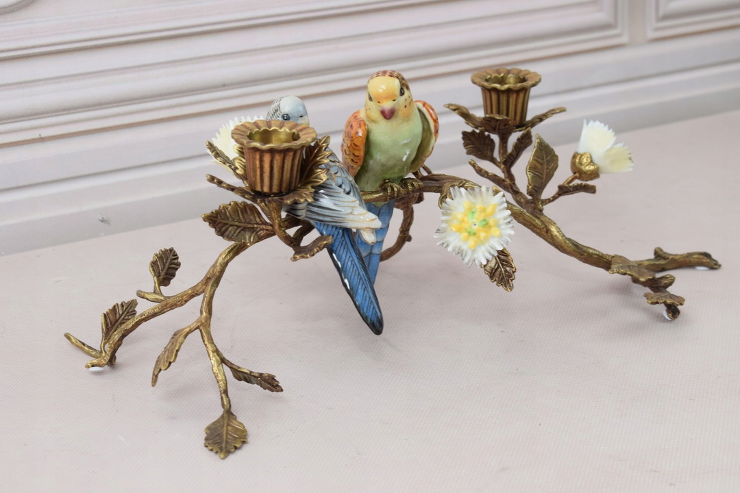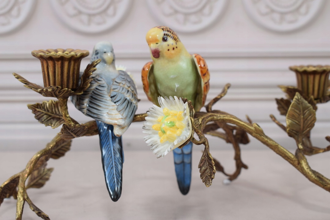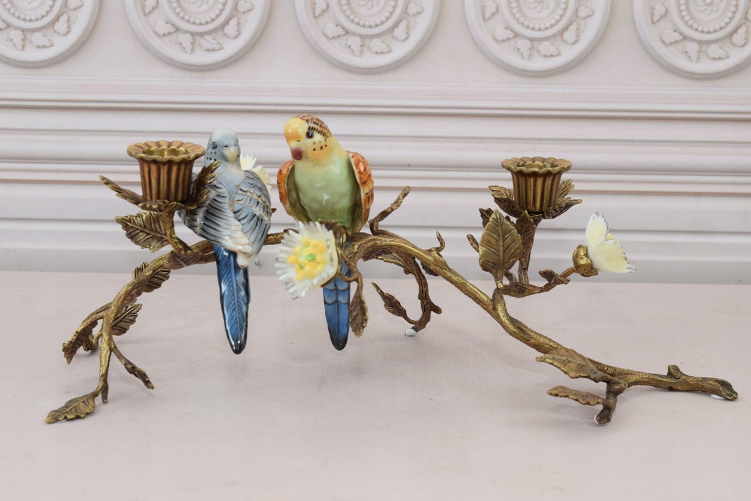 Witam, w dniu dzisiejszym pragnę zaoferować Państwu świecznik, PAPUGI wykonane z porcelany zaś świecznik i zdobienia z brązu.