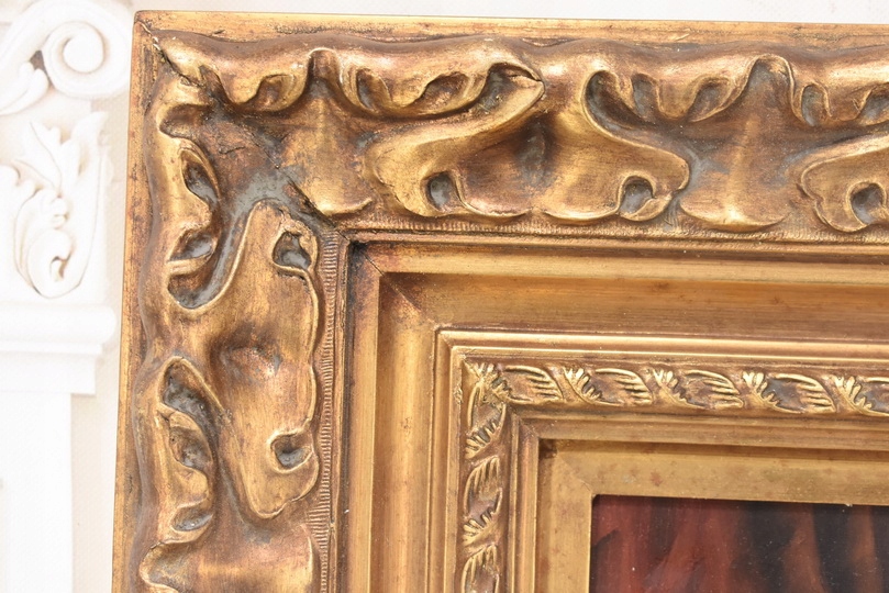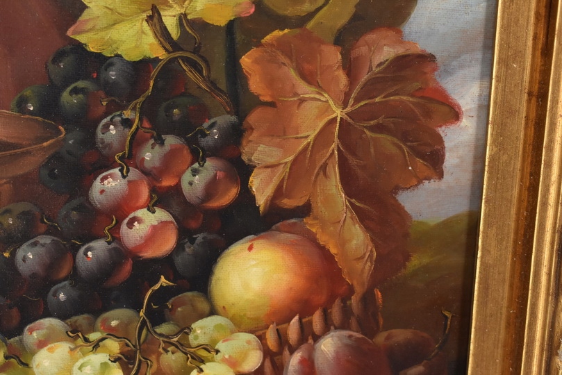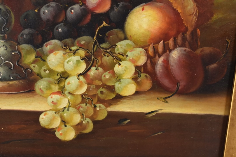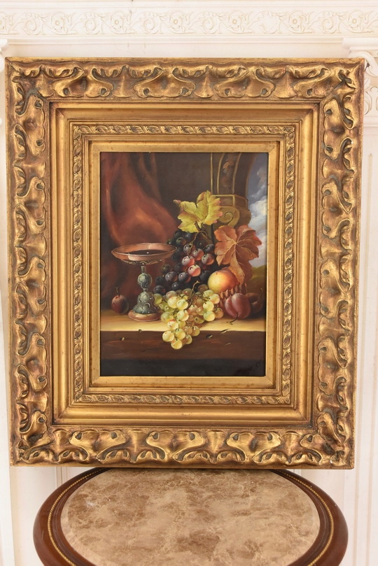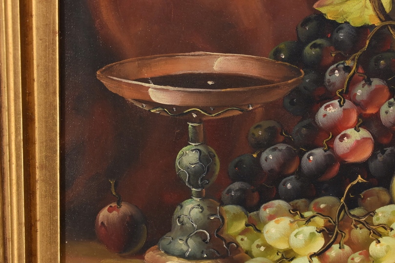 Martwa natura przedstawiająca winogrona i kielich ustawione na stole, utrzymana w klasycznym, ponadczasowym stylu. Obraz olejny zachwyca ciepłą kolorystyką, subtelną grą światła i starannie oddanymi detalami, a zdobiona rama dodatkowo podkreśla jego dekoracyjny charakter. Idealny do salonu, jadalni lub stylowego gabinetu.