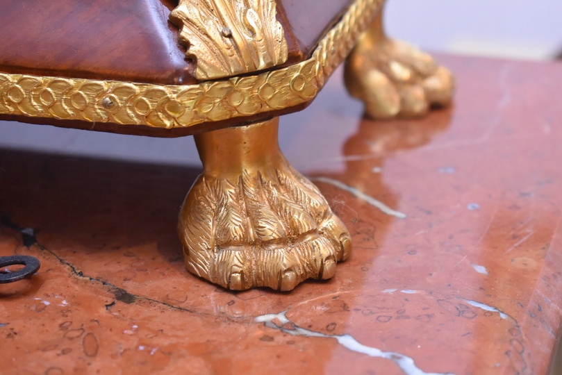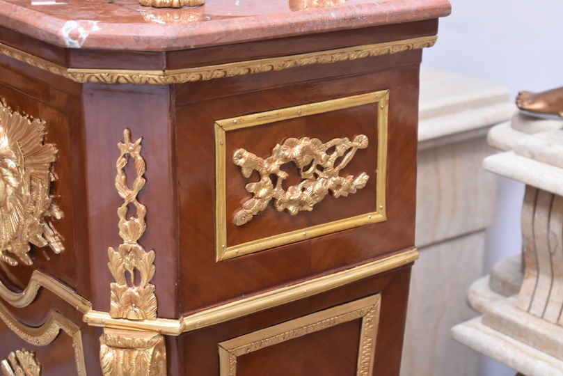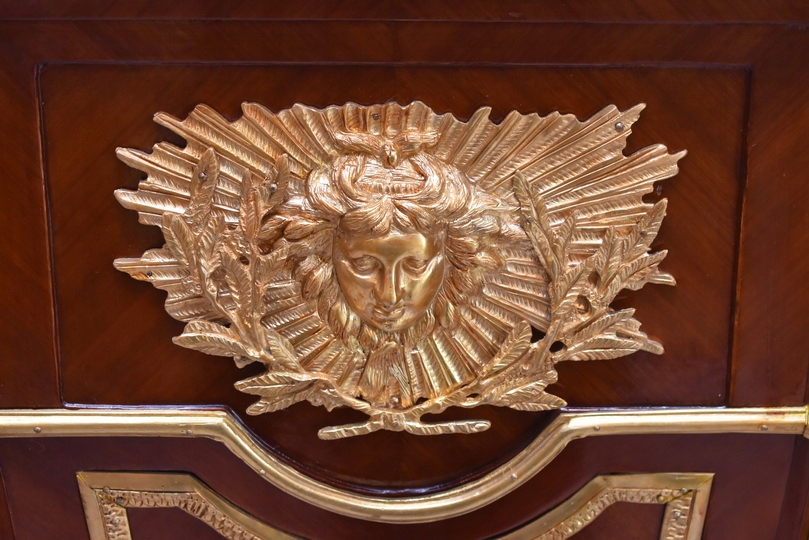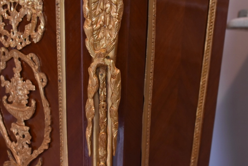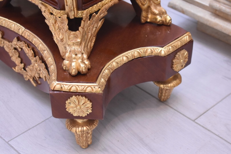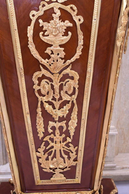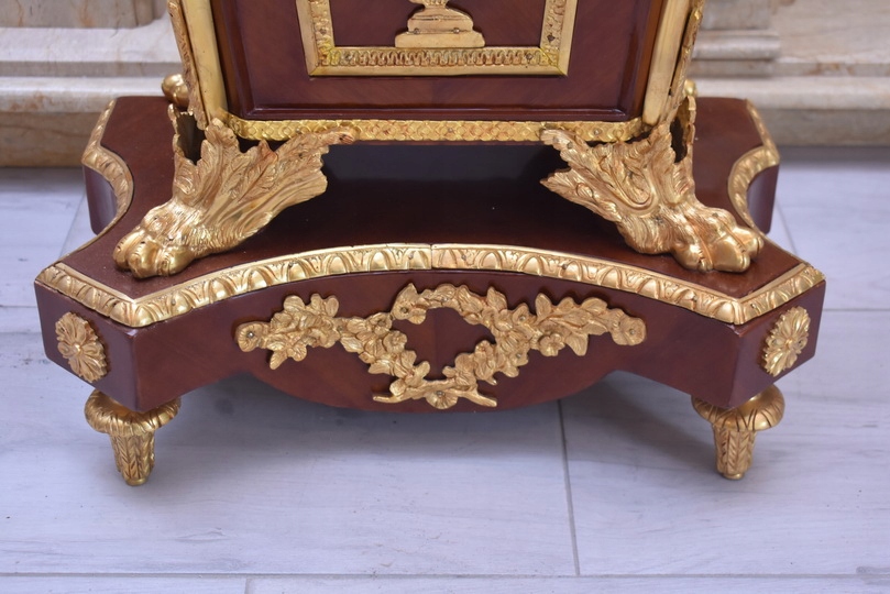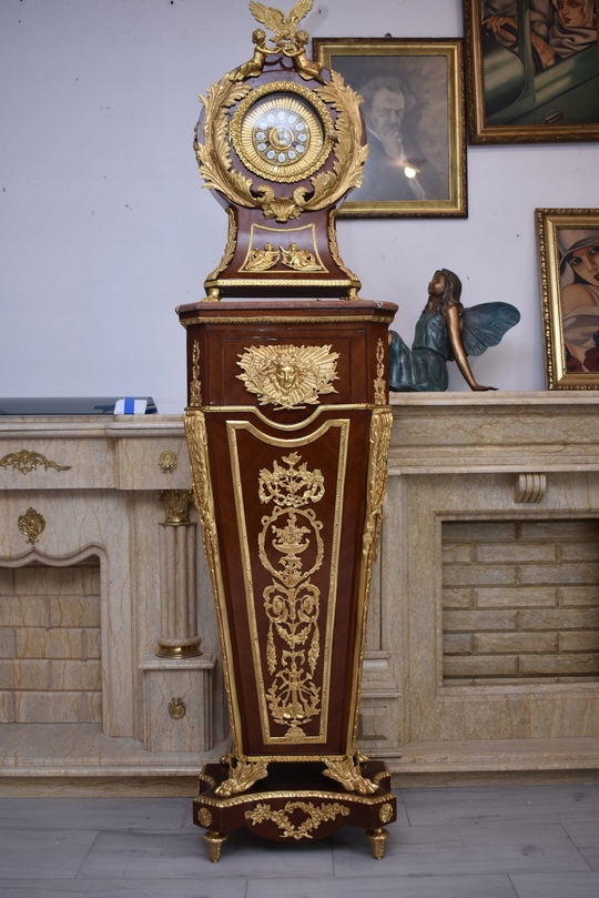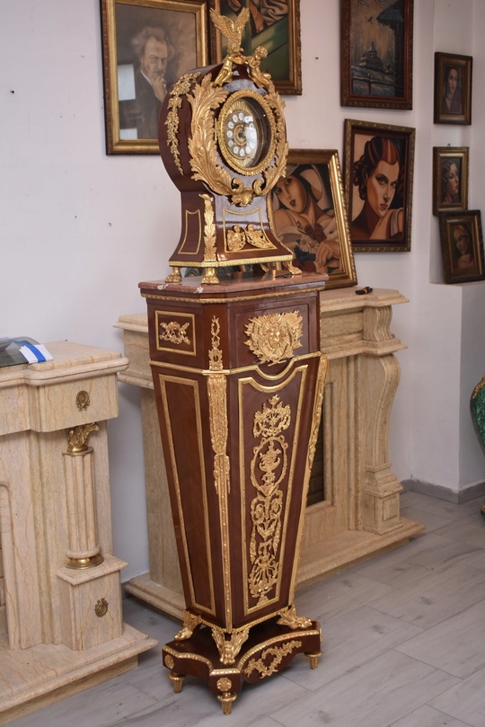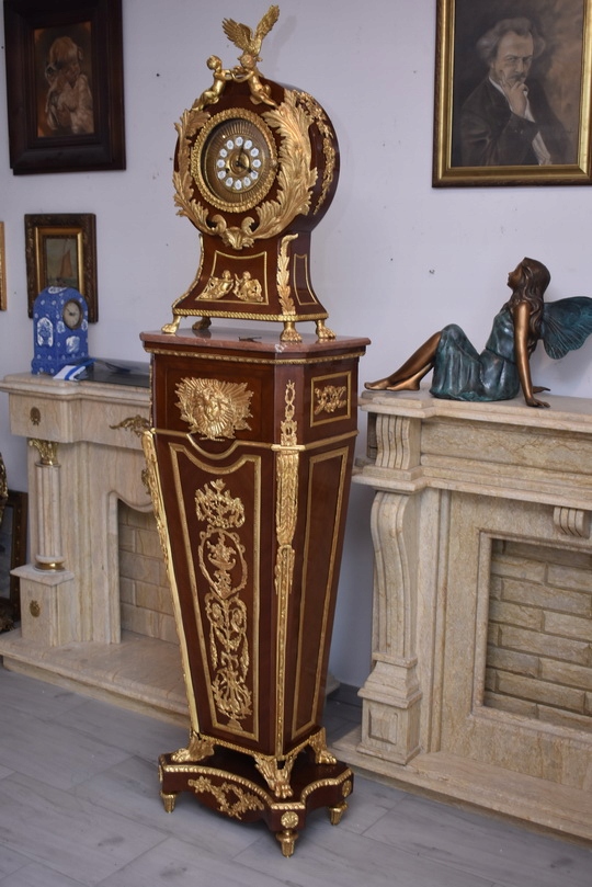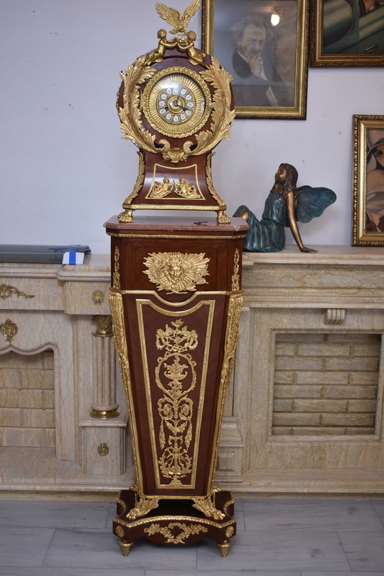 Oferujemy niezwykle dekoracyjny zegar cokołowy w stylu Ludwika XVI, inspirowany projektami słynnego królewskiego ebenisty Jean-Henriego Riesenera. To elegancki, masywny mebel o wyjątkowym charakterze, który łączy klasyczną francuską formę z bogatymi zdobieniami z brązu złoconego.