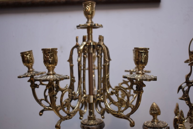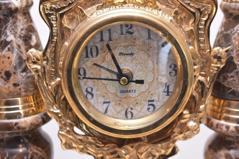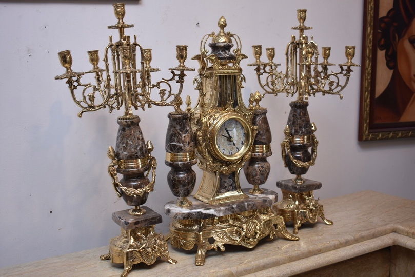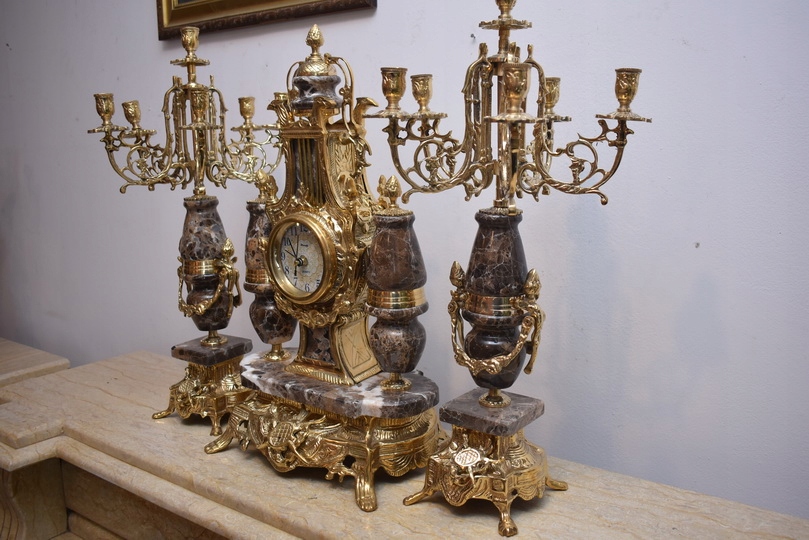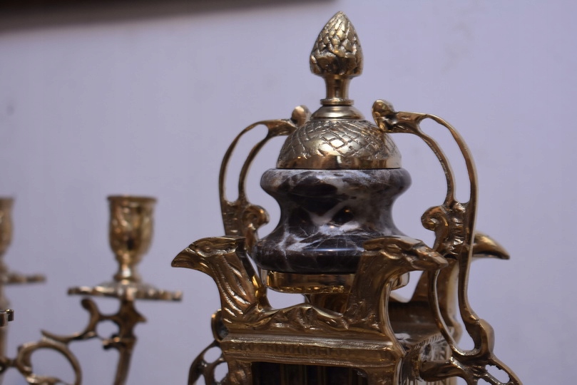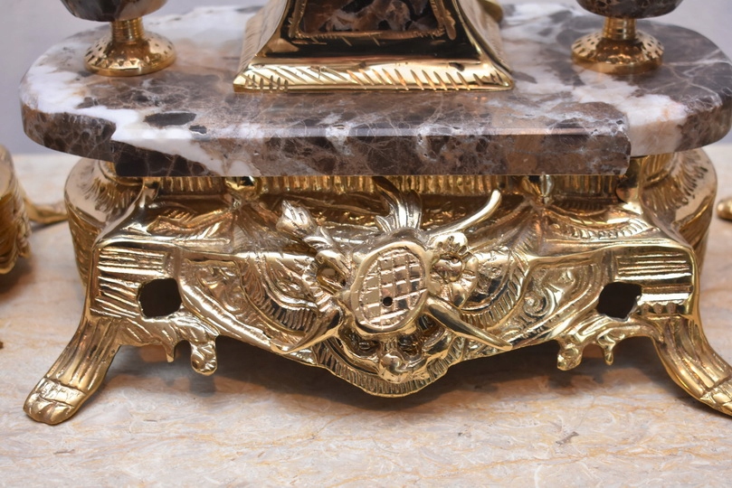 Zegar Kominkowy + 2 Kandelabry Świeczniki - Mosiądz + Marmur - Zestaw
