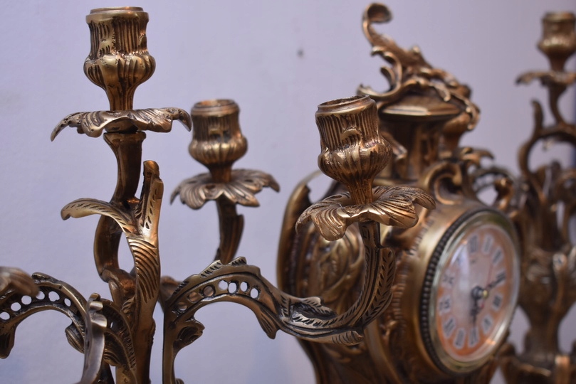 Strona główna » Kolekcje i sztuka » Design i Antyki » Zegary, zegarki » Kominkowe » Zegar Kominkowy + 2 Kandelabry Świeczniki - Mosiądz + Marmur - Zestaw