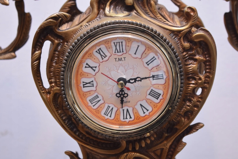 Zegar Kominkowy + 2 Kandelabry Świeczniki - Mosiądz + Marmur - Zestaw