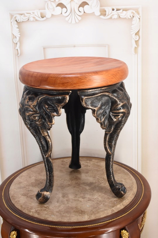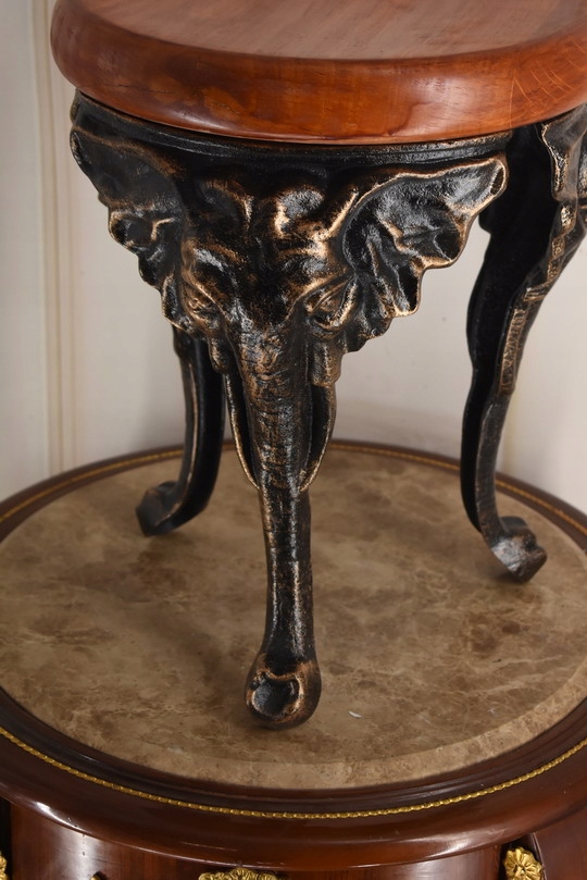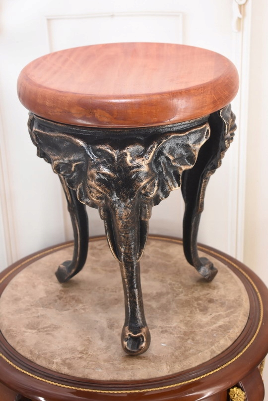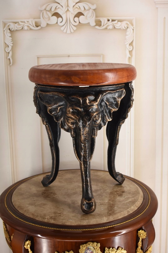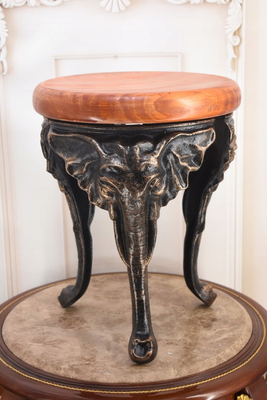 Wyjątkowy stolik dekoracyjny w stylu vintage, wykonany z solidnego żeliwa oraz naturalnego drewnianego blatu. Jego największą ozdobą są pięknie wykonane słonie – symbol siły, szczęścia i harmonii. Idealny jako kwietnik, stolik pomocniczy, dekoracja salonu, korytarza czy ogrodu zimowego.