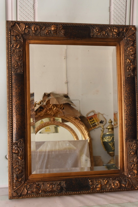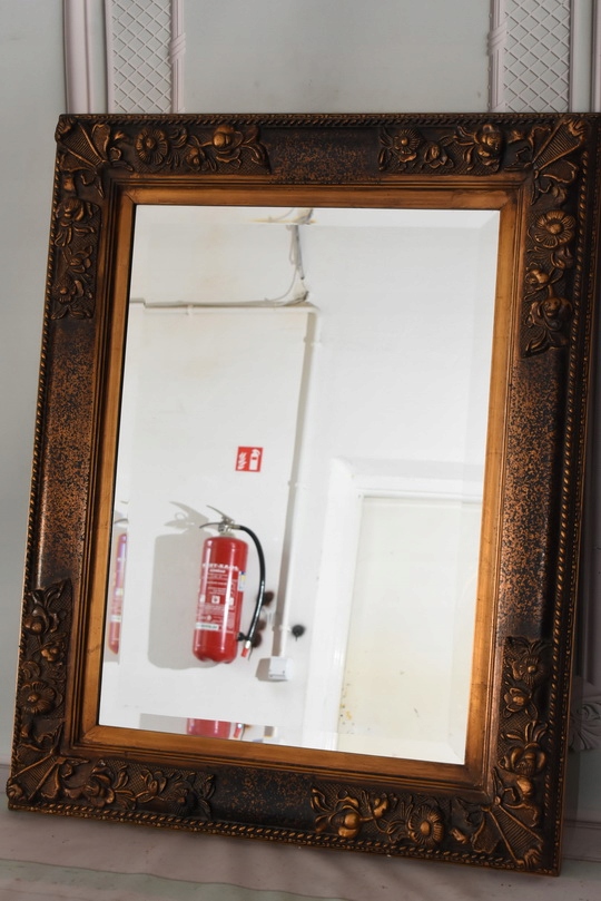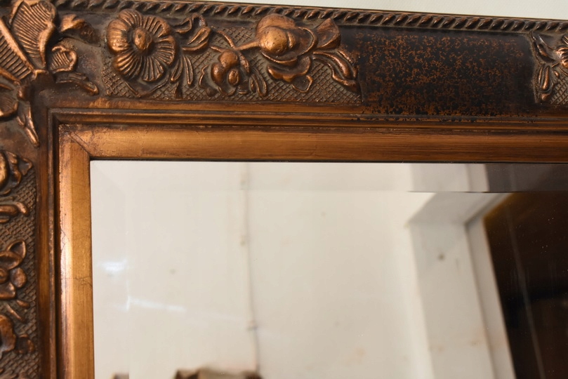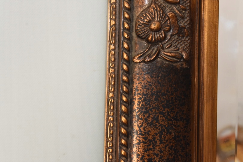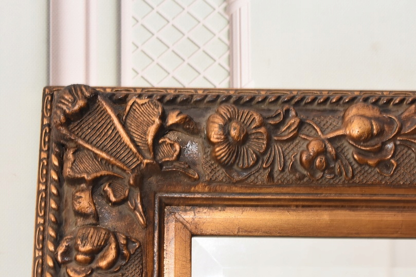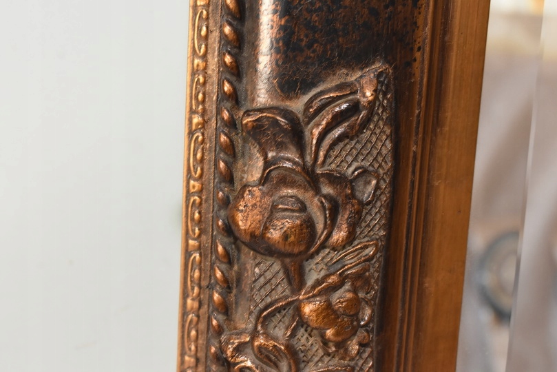 Eleganckie lustro kryształowe w stylu secesyjnym, oprawione w bogato zdobioną drewnianą, złoconą ramę. Prostokątny kształt i dekoracyjna forma sprawiają, że idealnie pasuje do wnętrz klasycznych, pałacowych oraz stylizowanych. Duży rozmiar sprawia, że świetnie sprawdzi się zarówno jako funkcjonalne lustro, jak i ekskluzyjna dekoracja.
